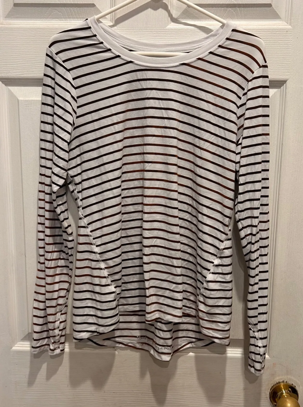 EUC. No flaws. UA to UA 21" Front length 25" Back Length 27" Measured flat and approximate Department: Women Type: T-Shirt Style: Basic Features: Lightweight, Breathable Neckline: Round Neck Performance/Activity: Yoga, Gym & Training Sleeve Length: Long Sleeve Closure: Pullover Material: Polyester, Rayon, Spandex Pattern: Striped Fabric Type: Knit Occasion: Casual, Activewear Season: Spring, Fall Keywords: healing hands, striped top, long sleeve, crew neck, casual wear, healthcare apparel, workwear, breathable fabric, comfortable, athleisure, everyday essential, modest