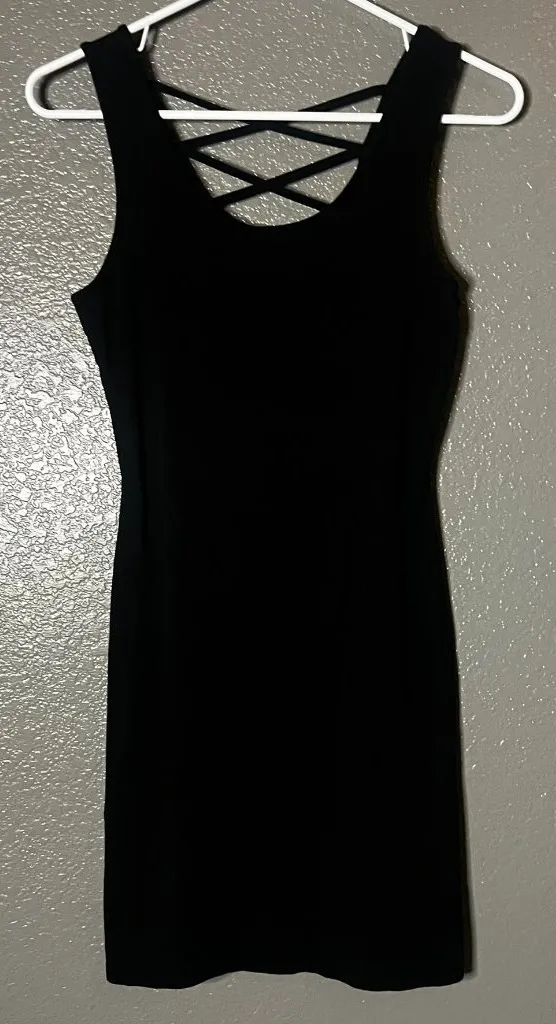 P2P: 14.5" Length: 32" Materials: Not listed; feels like a soft, stretchy knit blend. Notes: Sleek black sleeveless bodycon dress featuring a flattering scoop neckline and stylish crisscross back detail. Form-fitting and comfortable with plenty of stretch. Perfect for nights out, parties, or layering with jackets and cardigans. #BodyconDress #LittleBlackDress #WomenStyle #CrisscrossBack #SleevelessDress #SizeSmall