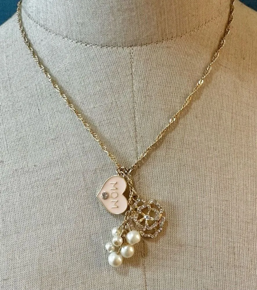 Heart says mom on it faux pearl cluster Rhinestone flower charm necklace Gold tone Great condition Lobster clasp with extender Please see photos. They are part of the description. Happy to answer any questions. New listings every day. Thanks for stopping by! G