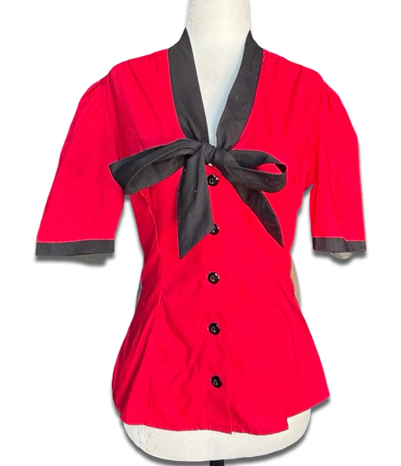 Heart of Haute women’s blouse Red and black colorway Classic bow tie neckline detail Contrast black trim at collar and sleeves Short sleeve tailored fit Button front closure Sassy retro silhouette Made in USA 100 percent cotton Lightweight woven fabric Flat Lay Measurements 19 inches pit to pit 21 inch length Great statement blouse for retro pinup rockabilly looks