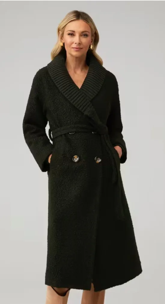 Stylish dark green wool blend coat with a belted waist and button details. Perfect for a chic look.... Show more
