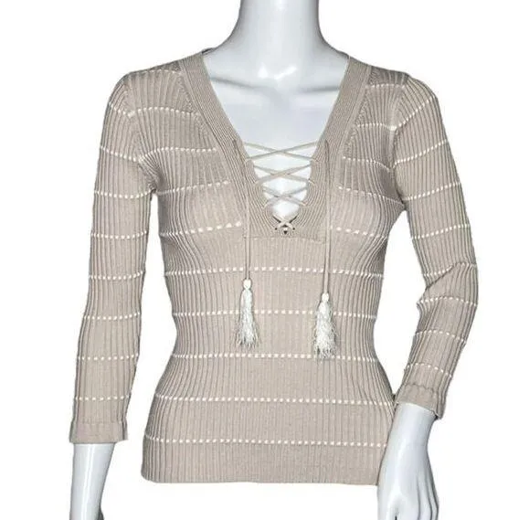 Women’s Size XS Extra Small 3/4 Sleeve V-Neck Fitted Ruffle Cuffs Pullover Style Rayon Nylon Blend Stretch Neutral Measurements are Approximate: Length 21” Armpit to Armpit 15” plus stretch Gently Used Condition. No Rips Tears or Stains (C1)