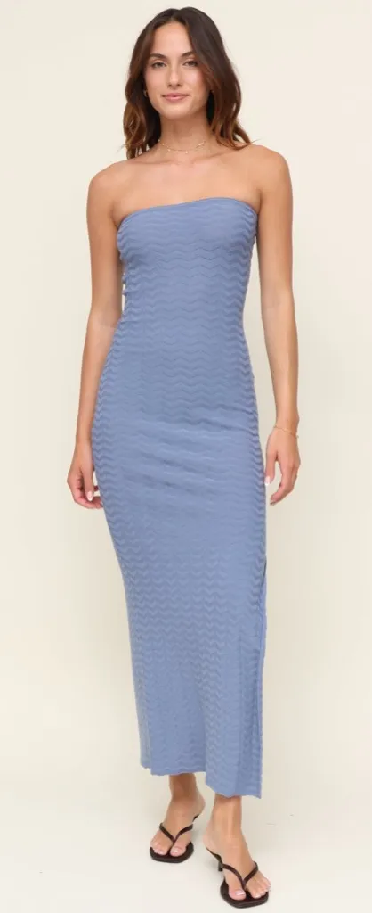 The Reyes Dress is a sleek, strapless column silhouette that hugs in all the right places. Crafted from a textured stretch fabric in a dusty blue hue, it’s effortlessly elegant with just the right amount of edge. Perfect for a night out or dressed down with sneakers for a cool-girl vibe.
