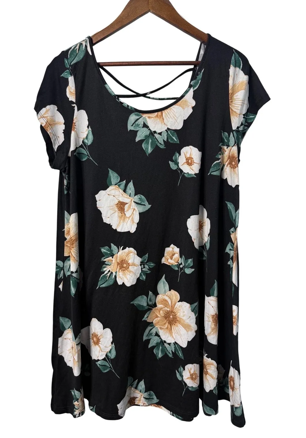 Womens black dress featuring a bold floral print with white and peach-toned blooms and green leaves. This short sleeve A-line dress has a flattering cut and a distinctive crisscross detail at the back of the neckline. Perfect for a casual day out, a brunch with friends, or a summer picnic. Style: Shift, T-Shirt Dress, Sundress Dress Length: Knee Length Department: Women Sleeve Length: Short Sleeve Pattern: Floral Occasion: Casual Material: Polyester Blend Fabric Type: Knit Theme: Tropical, Bohemian Neckline: Round Neck Season: Spring, Summer Sleeve Type: Cap Sleeve Closure: Pullover Accents: Strap Keywords: floral dress, a line dress, crisscross back, short sleeve dress, womens dress, black floral, summer dress, casual dress, day dress, garden print, feminine, comfortable, easy wear
