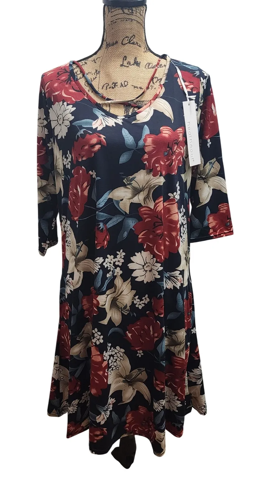 A chic and comfortable Heathmoor midi dress, featuring a vibrant floral print in navy, red, and white. This dress has a flattering V-neckline with a unique criss-cross detail, and three-quarter sleeves, offering a stylish yet relaxed silhouette. Perfect for a casual brunch with friends, a garden party, or a weekend getaway. Chest 40 Length 38 Style: A-Line Dress Length: Midi Department: Women Sleeve Length: 3/4 Sleeve Pattern: Floral Occasion: Casual Material: Rayon, Polyester Blend, Spandex, Rayon Blend Neckline: V-Neck Theme: Floral, Flower, Casual Fabric Type: Rayon Season: Spring, Summer, Fall Closure: Pullover Keywords: Heathmoor, midi dress, floral dress, womens dress, navy dress, red dress, white dress, casual dress, three quarter sleeve, V neck dress, new with tags, dress, large dress