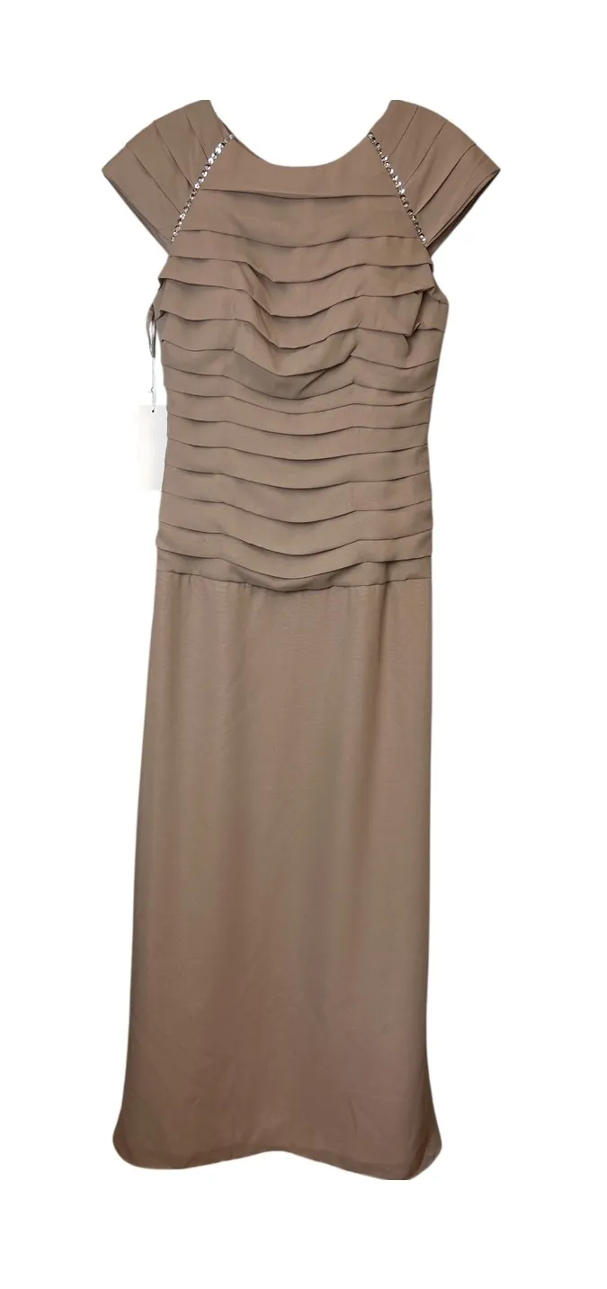 Elegant evening gown, perfect for making a statement at your next special event. This sophisticated dress features a flattering silhouette with a tiered, horizontally pleated bodice that adds texture and visual interest. Rhinestone detailing along the cap sleeves provides a touch of sparkle and glamour. The dress flows into a floor-length skirt, creating a graceful and elongated look. A concealed back zipper ensures a smooth and seamless fit. Ideal for formal events, weddings, or black-tie affairs, this gown will ensure you look and feel your best. Measurements: • Bust: 18 inches • Length: 60 inches Style: Ball Gown, Maxi Dress Length: Long Color: Beige Department: Women Sleeve Length: Short Sleeve Pattern: Solid Occasion: Formal, Party/Cocktail, Wedding Material: Polyester Neckline: Round Neck Character: Elegant, Glamour, Sophisticated, Classic, Refined Fabric Type: Chiffon Season: Fall, Spring, Summer Keywords: formal dress, evening gown, rhinestone dress, special occasion dress, wedding guest dress, prom dress, pageant dress, taupe dress, beige dress, cap sleeve dress, pleated dress, floor length dress, Hebeos dress, formal wear, women's dress