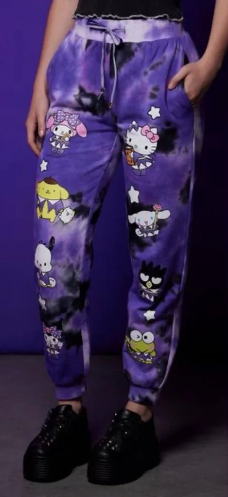 HOT TOPIC & Hello Kitty characters on purple tie-dye joggers. Comfortable and fun for Women’s size S... Show more