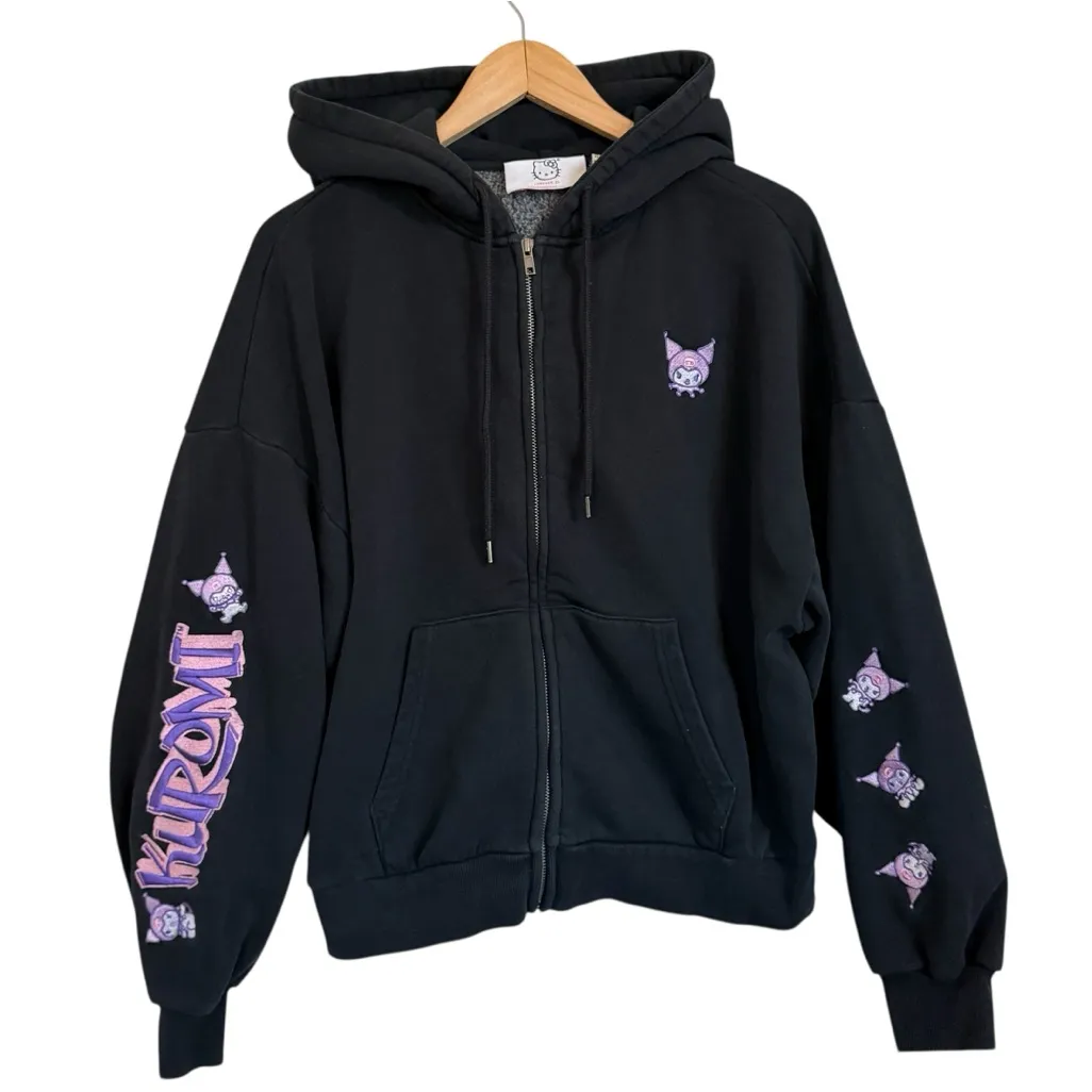 Hello Kitty Kuromi Hoodie Womens Medium Black Forever 21 Sanrio Zip Up Sweatshirt Condition: Gently worn, no visible flaws. Minor general wear expected from previous use, see photos for full details. Official Hello Kitty and Friends collaboration with Forever 21 featuring Kuromi character designs Embroidered Kuromi character patches on both sleeves and chest Large spell out "KUROMI" text with character graphics down one sleeve