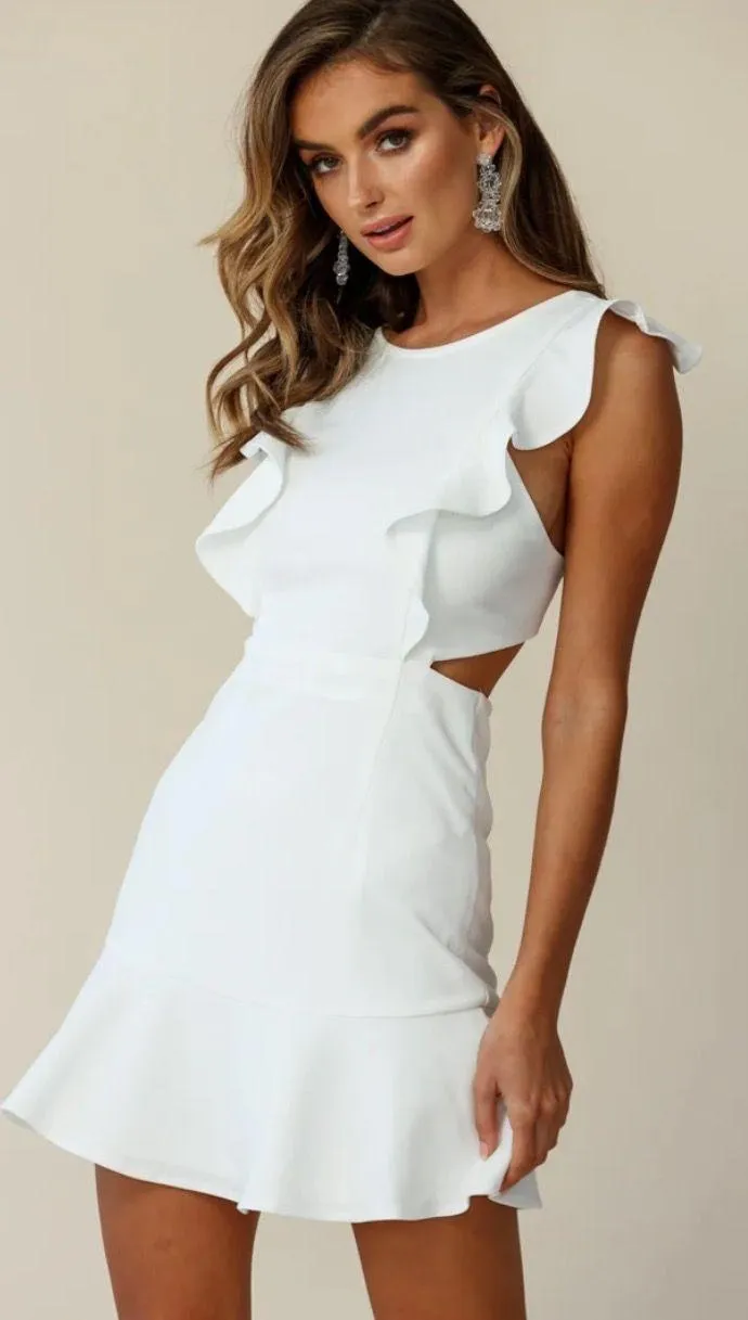 White mini dress with a high neck, ruffles, and cute open back detail! So spunky and classy! Worn... Show more
