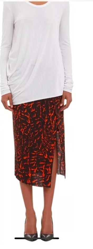 Helmut Lang Strata Asymmetrical Twist Knit Black Knit Skirt ~ orange graphic print on a black knit background ~ mini length underlay, below the knee midi overlay ~ front waist dips a little and has a twist knot ~ deep split to show mini skirt ~ soft and stretchy fabric ~ fits close to body, hugs your curves ~ elasticized hidden waist ~ excellent condition Size: Medium. Fits size 8 Midi length: 31” Mini length: 18.5” Waist: 30” Party fun unique date travel cocktail brunch Day to Evening Date night glam chic designer festival abstract print black and orange rust contemporary statement piece high low