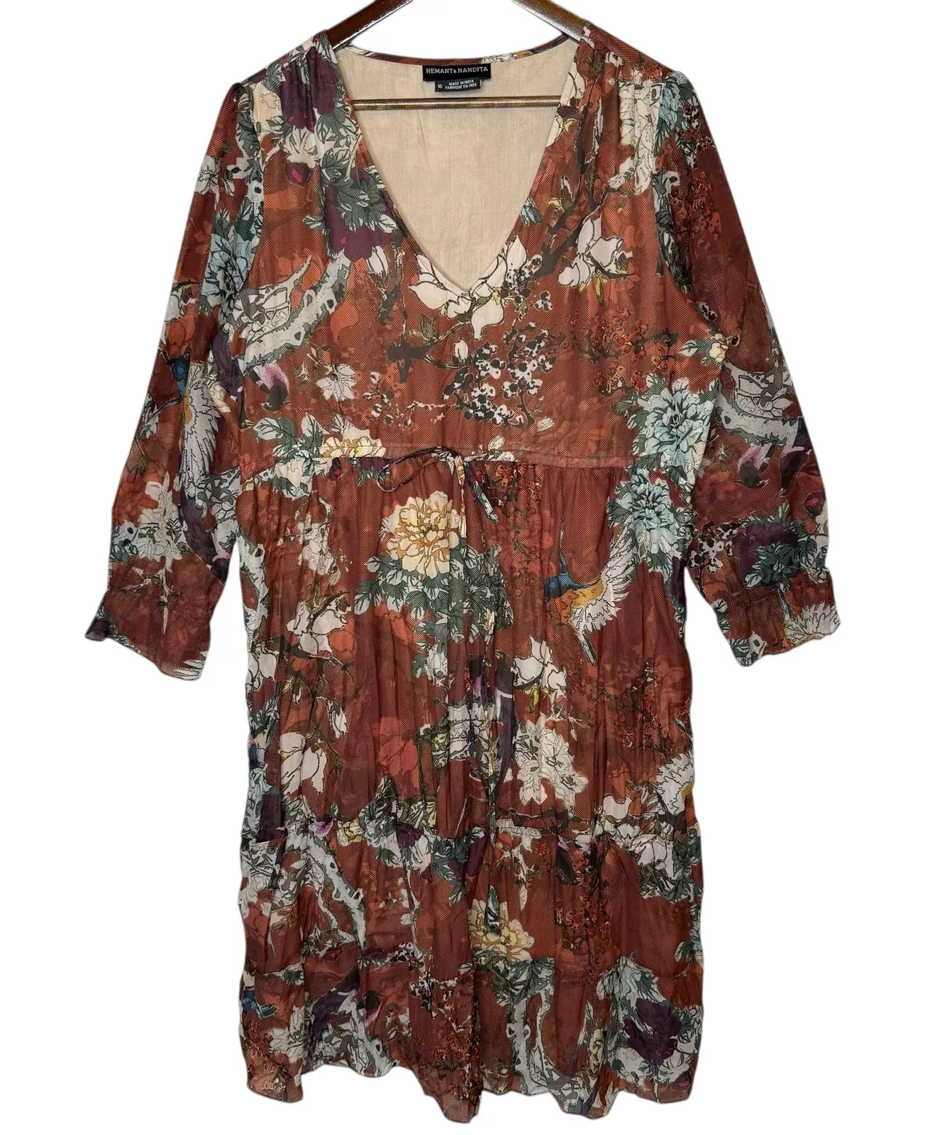 Hemant & Nandita Anthropologie Zeri Floral Print Peasant Midi Dress Brown size 16 In good condition. Please see last photos for blemishes to fabric at neckline, tie, and each underarm seam. 100% Polyester with 100% Rayon lining Midi length dress Peasant silhouette at bodice with tiered skirt V neckline Adjustable tie waist 3/4 length sleeves with elastic cuffs Lined bodice and skirt, sheer sleeves Made in India Measurements: 23in underarm to underarm 19.5in across waist 43in shoulder to hem boho, romantic, cottagecore