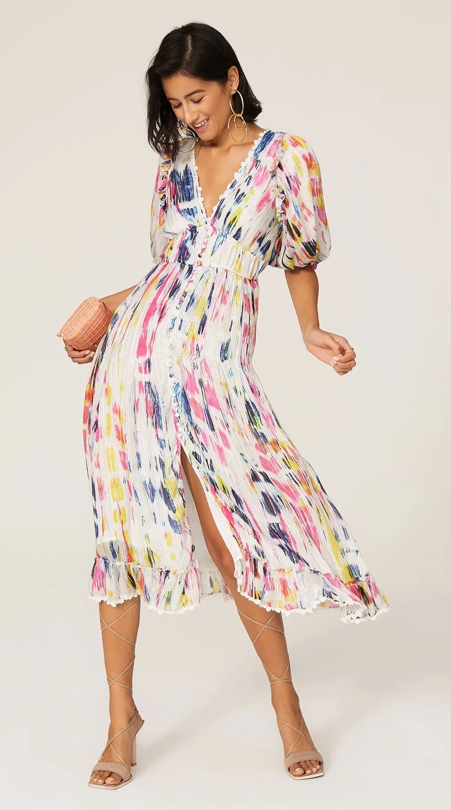 Good preowned condition. Moderate wear with some loose metallic threads throughout. Size: Small Approximate measurements with garment laying flat: 18” bust, 16” waist, 47” length Color: Multicolor White multi printed cotton (100% Cotton) Abstract tie dye print Empire Short puff sleeves V-neckline Exposed front button down closure Midi length OFFERS WELCOME BUNDLE & SAVE MORE SAME OR NEXT DAY SHIPPING ITEMS PACKAGED WITH CARE