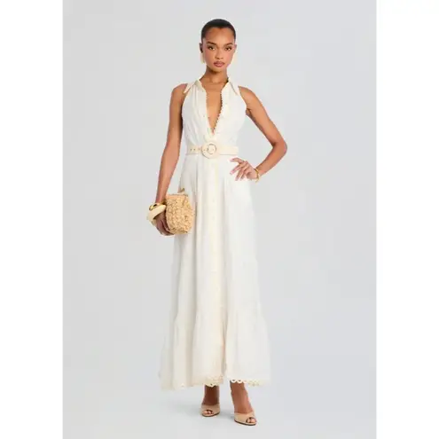 A vibrant clean white dances across the dress's breezy, eyelet-embellished fabric. The halter neckline and cinched waist lend a flattering silhouette. A coordinating belt buckle adds a touch of refinement. Perfect for warm-weather occasions, this dress captures a mood of relaxed sophistication. Self: 80% viscose, 20% nylon Lining: 100% cotton Made in India Dry clean only Fully lined Front button closure Optional belt at waist Side slit pockets Textured linen fabric with lace trim Our Style No. BENF-WD199 Manufacturer Style No. HN-ANVI-5795 Color: White MSRP: $598 Features: • Totally Sold out on FWRD! Size: Womens XS Measurements taken flat across, Bust 14 in / 36 cm Hips 16 in / 41 cm Length 55 in / 140 cm Waist 13 in / 33 cm Condition: New With Tags Tags: night out, party, event, date night, sexy, bodycon, graduation, mini, cocktail, going out, bright colorful, fancy, wedding guest, sheath, brunch, bachelorette, simone, rush, sorority, designer, luxury, high end, runway, revolve, dress, flirty, party, event, special occasion, boho, cocktail, wedding, fwrd, saloni, belted, date night, brunch, valentines, feminine, romantic, anthropologie, boho, bohemian, sexy, mini, eyelet, beach, vacay, vacation, white, cream, ivory, neutral, bride, bridal