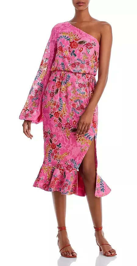 Excellent preloved condition, no belt included. Small discoloration on front that is hardly noticeable. Size: Small Material: Self: 100% viscose; lining: 100% polyester Stretch: Yes Care: Dry clean Closure: Side zip closure Style Notes: One shoulder neckline. Sleeveless. One long bishop sleeve. Blouson bodice. Attached self-tie belt with tassel ends. Side slit. Ruffled hem. Allover floral print. Partially lined Tags: feminine, casual, party, wedding, summer, date night, girls night, vacation