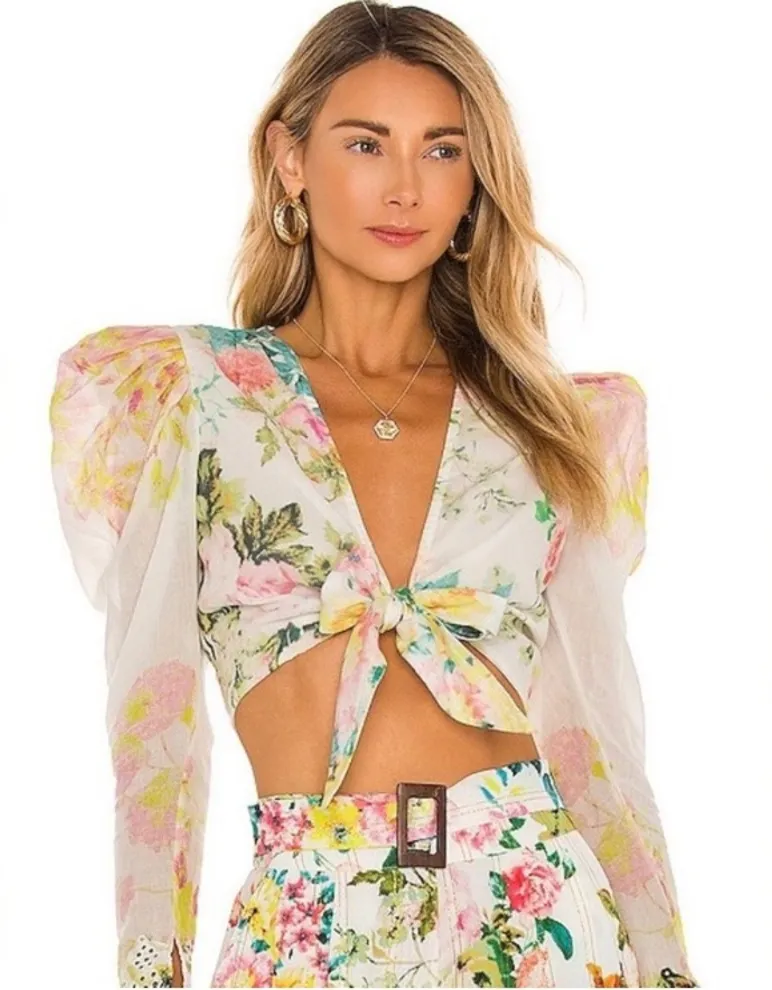 Hemant & Nandita x Revolve Teien top. Pastel floral colorway. Puff, slightly sheer long sleeves. Tie... Show more