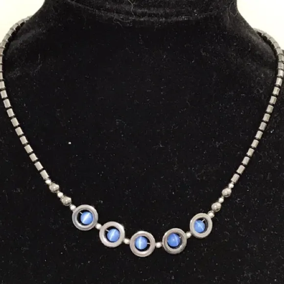 Hematite & Dyed Blue Cat's Eye Collar Necklace Screw Clasp Punk Rock Silver - $13 - From AJ