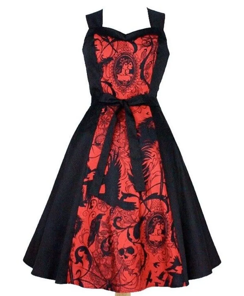 Hemet black & red steampunk dress size small. Preowned great condition, worn once. 16.5 in pit to pit, 40 in top to bottom: ☮️ Machine washable, It's a new vintage inspired design that incorporates a full circle skirt style with a fitted bodice. The dress has a small belt that can be worn in front or back. The fit is perfectly flattering on all body types. It's the perfect dress for this holiday season. -98% cotton 2% spandex -Machine Washable Cold -No slip Needed/ Complete coverage -Fully lined Top -Made in the USA