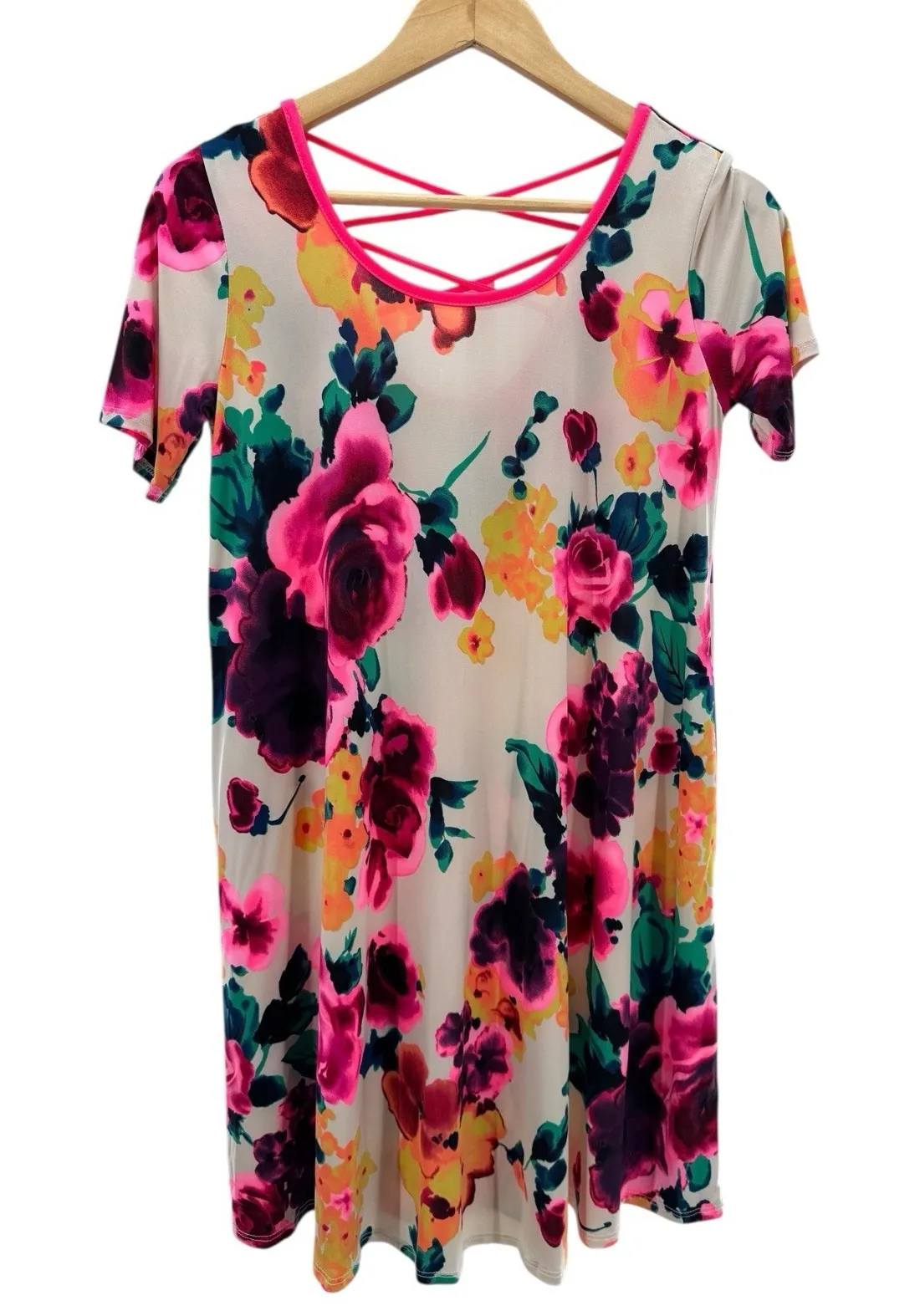 Brighten up your wardrobe with this Hemish USA short sleeve floral knit dress in size Small. Features a vibrant allover floral print, soft stretch fabric, and a trendy crisscross back detail. Lightweight and wrinkle-resistant—perfect for packing on vacations or weekend getaways. Easy pullover style. Hemish USA, floral print dress, small, stretchy knit dress, vacation outfit, summer travel dress, casual short sleeve, bright colors, boho style, easy travel piece Bold | Feminine | Resortwear | Casual Chic | Lightweight & Wrinkle-Friendly