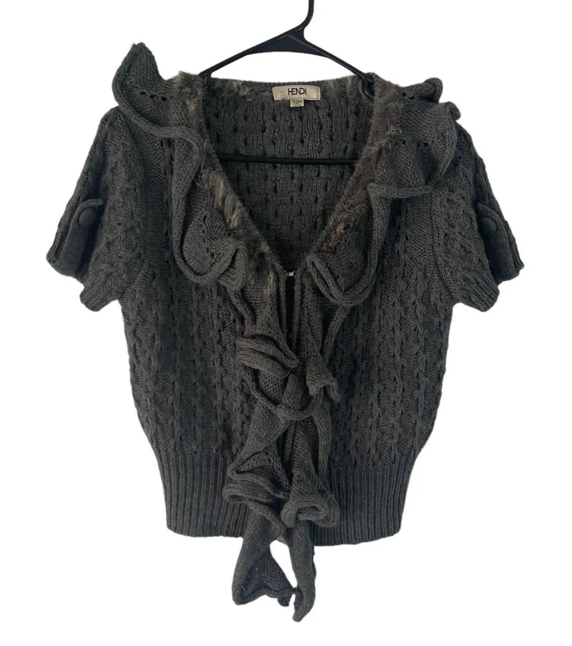 Hendi Women's Size Small Grey Wool Ruffle Knit Academia Sweater Cottage coquette feminine fairy Ruffle knit trim Cable knit fabric Hook and eye front closure Short sleeves V Neck Item is in excellent preloved condition! All Measurements, and material content tags are in the photos. Pit to pit: 15" Neck to hem: 19.5" Tags: Fall, Spring, Academia, School, College, Work, Office, Errands, Daytour, Travel