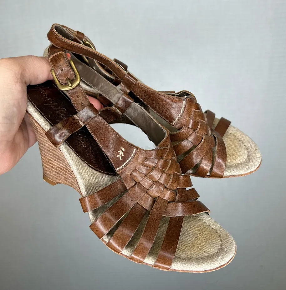 Size 38 or US woman’s 8 VTG brown leather strappy wedges These brown wedges feature a sophisticated woven leather design with a medium-height heel, perfect for both casual and dressy occasions. The intricate basket-weave pattern and slingback strap with buckle closure add a touch of elegance. The slightly vintage finish enhances their timeless appeal. KK4