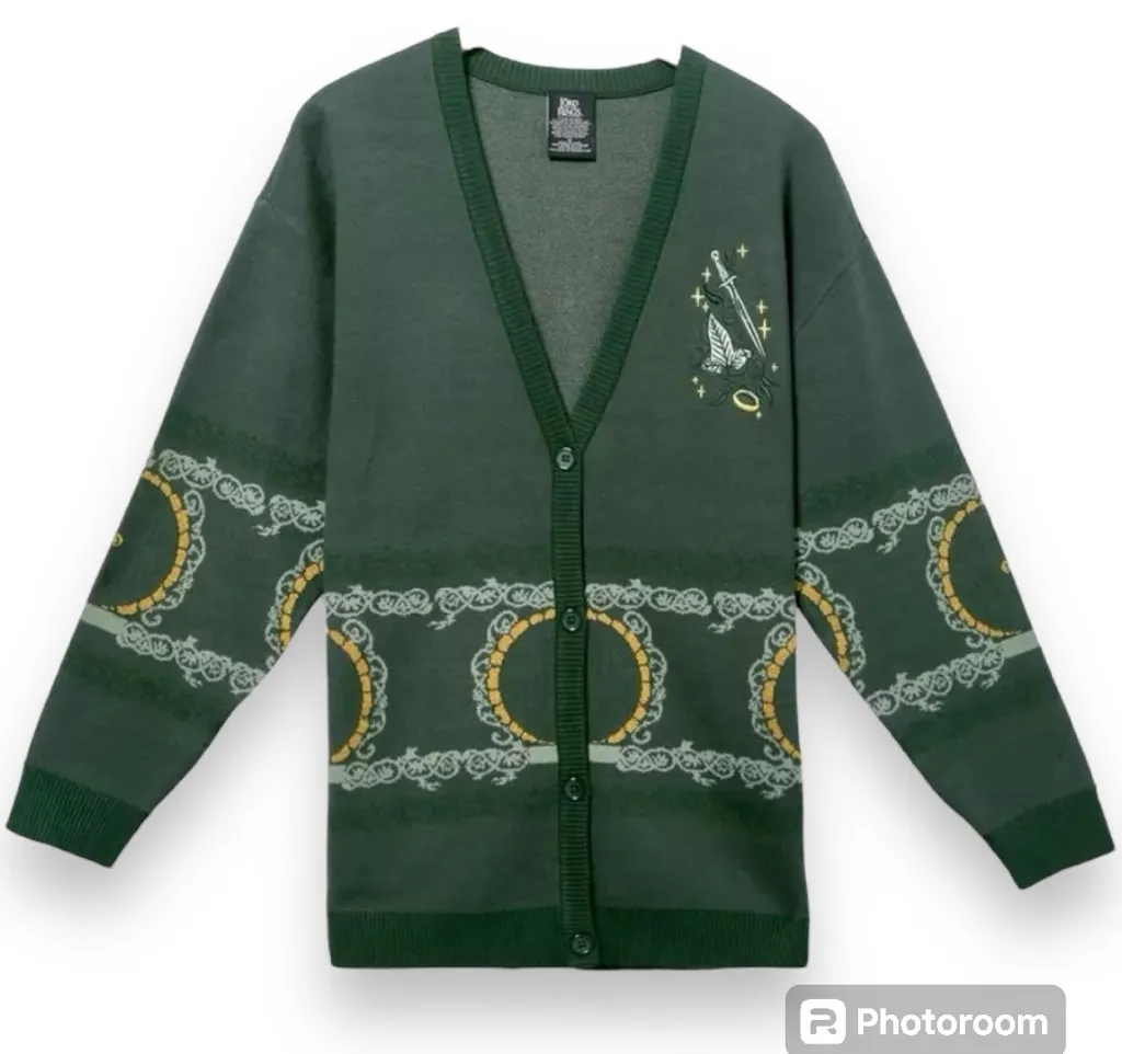 The Lord Of The Rings Icons Cardigan Keep cozy during your travels through Middle-earth in hobbit style! From The Lord of the Rings, this button-up cardigan features a hobbit door border around the sleeves and waist, plus the Lórien leaf, the One Ring and Sting embroidered at the chest. 50% rayon; 30% nylon; 20% polyester Wash cold; dry flat Listed in unisex sizes Large ***Can fit oversized for Women*** New with tags