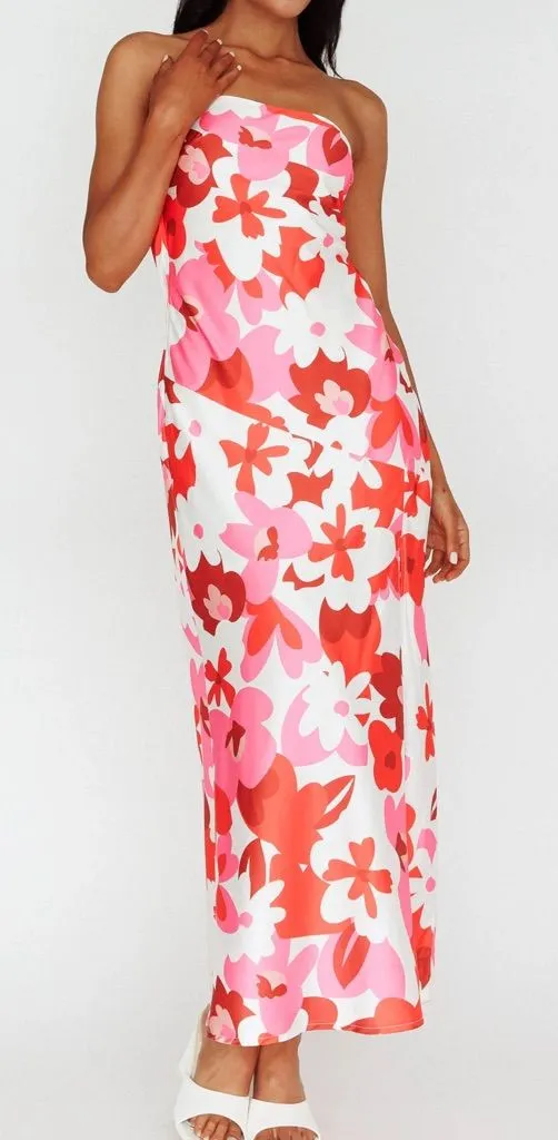 Floral red midi dress Same design as hello Molly EXPRESS IT ALL STRAPLESS SATIN MAXI DRESS WHITE Lined Strapless Front split Cowl back Lace-up back You will be a true showstopper in our gorgeous Latisha midi dress. We are head over heels for its strappy, cowl back! Perfect for a Summer wedding or girls' night out! Team it with white mules and a baguette bag to complete the look.
