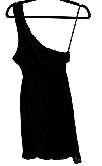 Size US Small S New with tags. No flaws. Sold at Selfie Leslie Asymmetrical One shoulder Solid black color Front tie skirt Faux wrap style Hidden zip back closure Lined 55% linen, 45% cotton RETAIL $80 Tags: asymmetric, lightweight, breathable, beach, party Bust: 15" Waist: 13" Length: 3.5" Not sure if it will fit? Measure 1 or 2 of your favorite clothing items and compare. Measurements are approximate flat-lay.