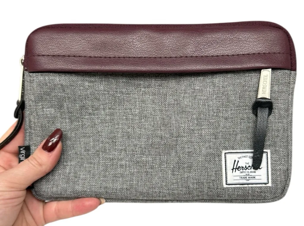 This stylish Herschel Supply Co. pouch features a grey textured fabric body paired with a maroon faux-leather trim. Compact yet functional, it’s perfect for travel, organizing tech accessories, cosmetics, or everyday essentials. A classic, unisex design that works year-round. Brand: Herschel Supply Co. Size: 9 x 6.5 in Measurements: Approximately 9” W × 6.5” H Material & Care: Fabric exterior with faux-leather trim; wipe clean Condition: Good preowned condition; light interior wear as shown Herschel pouch, Herschel clutch, travel organizer bag, tech pouch, cosmetic pouch, grey maroon bag, unisex travel case, Herschel Supply Co.
