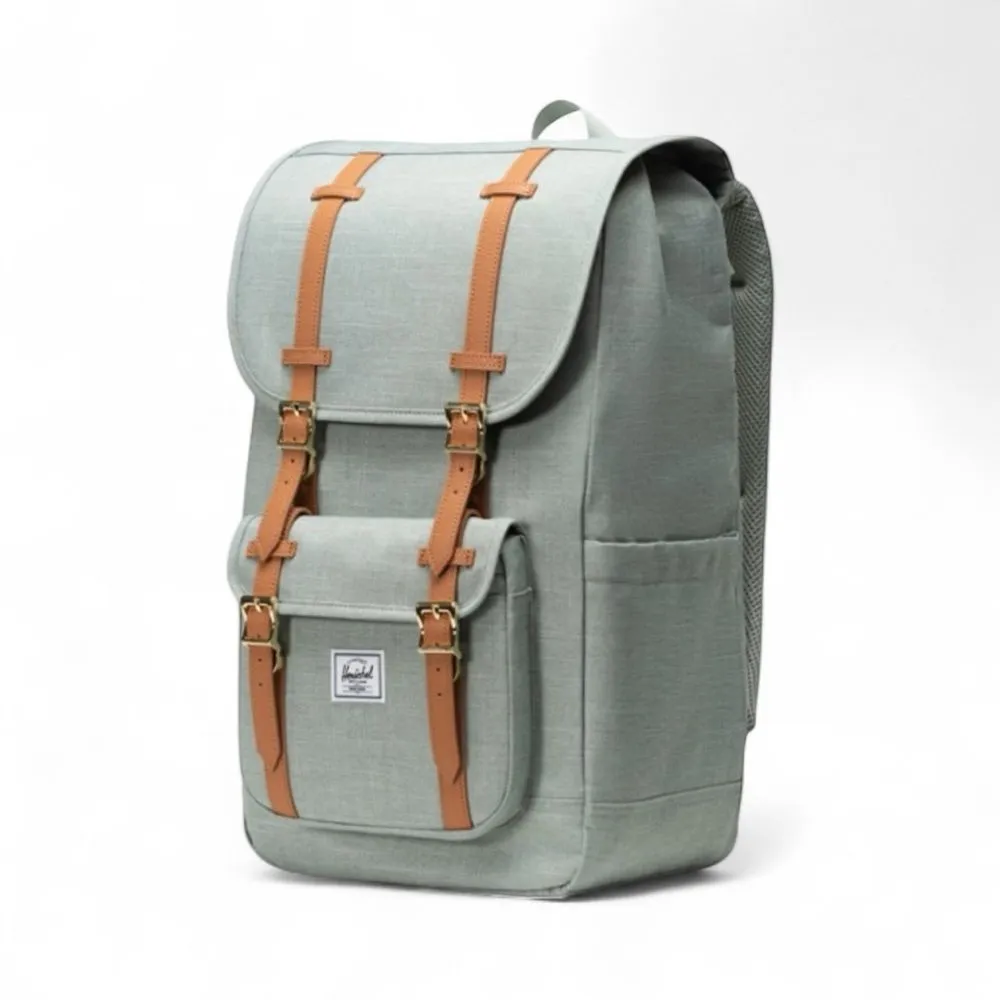 Designed to carry all your essentials for a full day, the Herschel Supply Co. Little America pack is inspired by iconic mountaineering style and reinvented with recycled EcoSystem™ materials Made with 100% postconsumer recycled material Features signature striped liner Drawcord closure Padded and fleece-lined 15 in. laptop sleeve Zippered front pocket with key clip; internal pocket Contoured shoulder straps Magnet-fastened straps with metal pin buckles Air-mesh back padding New without tags