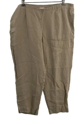 Slip on easily with a concealed elastic waist Flat front with hip seam pockets Cropped length Slim leg 100 % linen Unlined Very good preowned condition Waist 19" Rise 10" Inseam 22.5"