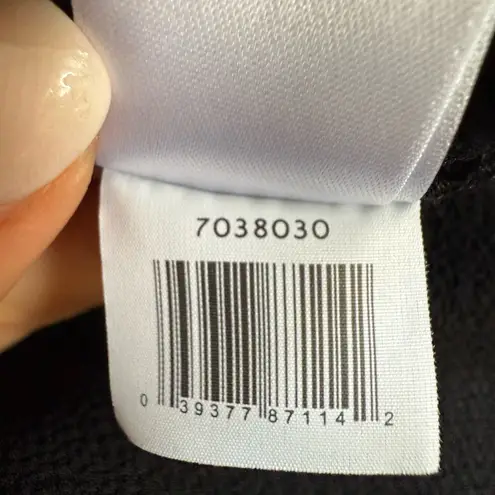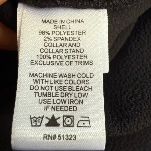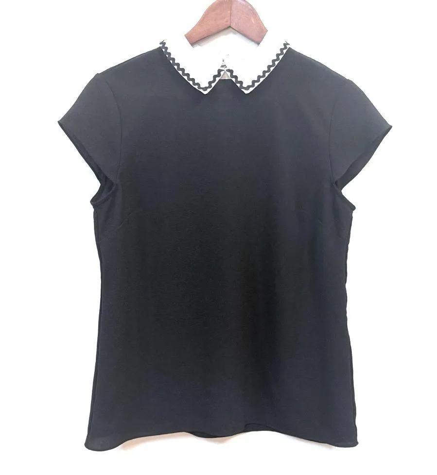 CeCe short sleeve black blouse with white contrast point collar and scallop trim detail. Button at back neck with CeCe logo. Lightweight woven fabric with slight stretch. Size Small. Details: • Shell: 98% polyester, 2% spandex • Collar: 100% polyester • Color: Black with white contrast collar • Size: Small • RN 51323 | Style 7038030 Condition: Excellent pre-owned condition. No flaws noted. CeCe, scallop collar, contrast collar, black blouse, workwear, classic