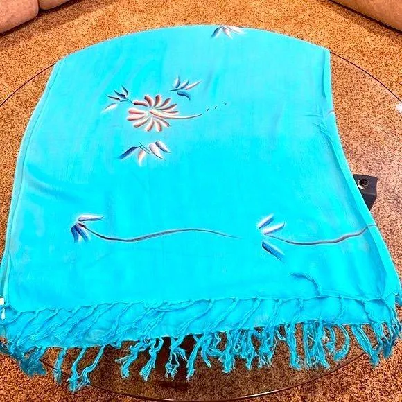 Excellent LIKE NEW condition never used. Appears hand painted sarong scarf in blue with tassels or fringe . fabric : rayon (soft) Size :48x65 inches Brand : hibiscus collection (Hawaii) Can be worn in several ways , knotted up to use a swim cover up, wrap dress, skirt , etc. Tags: vacation beach pool swim coverup swimsuit cover up cruise holiday tropical Hawaiian Hawaii