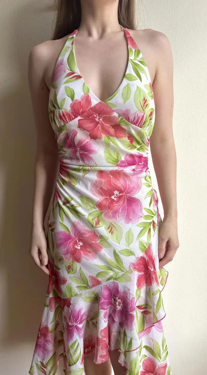 Beautiful pink, green, and white floral hibiscus print halter dress from City Triangles. THE y2k dre... Show more