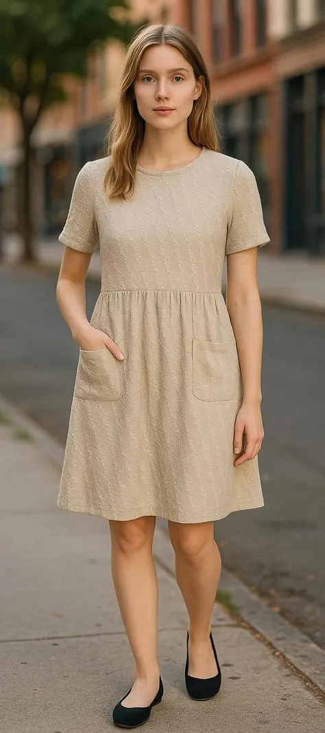 Hidden Alley Women's Small Beige Textured Short Sleeve Dress with Pockets Beige short sleeve dress with a textured fabric pattern. Knee-length with a gathered waist for a comfortable fit. Smoke free Lined