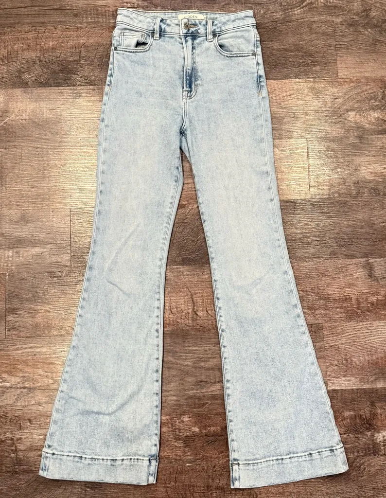 Light Wash/acid wash flare trouser jean from Hidden. They are the Happi Flare. Purchased from Buckle. High waisted. Stretchy material. There is one small spot on the back of one leg (see last photo) not very noticeable. Preowned condition. Please see all photos for item details and condition. Size 25 x 32 Ships from a smoke free, pet friendly home. Thank you for stopping by my shop! All items are shipped within two business days.
