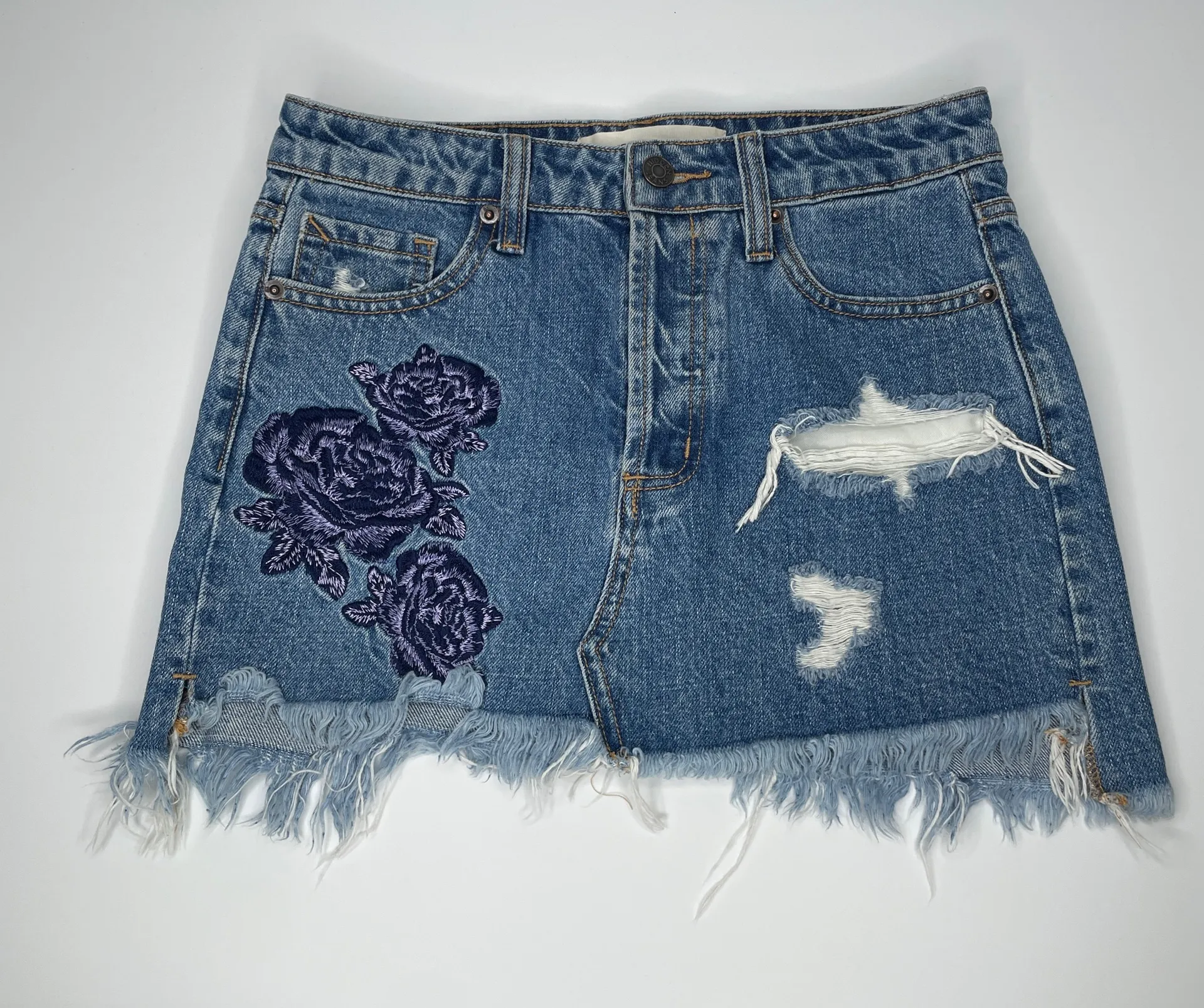 Hidden Jeans Denim Skirt Size Womens XS Color Blue with Floral Embroidery Clean preowned condition Raw Hem, Distressed, Front and Back Pockets, Floral Embroidery, RN# 129203, 100% Cotton, Button Fly Clean preowned condition