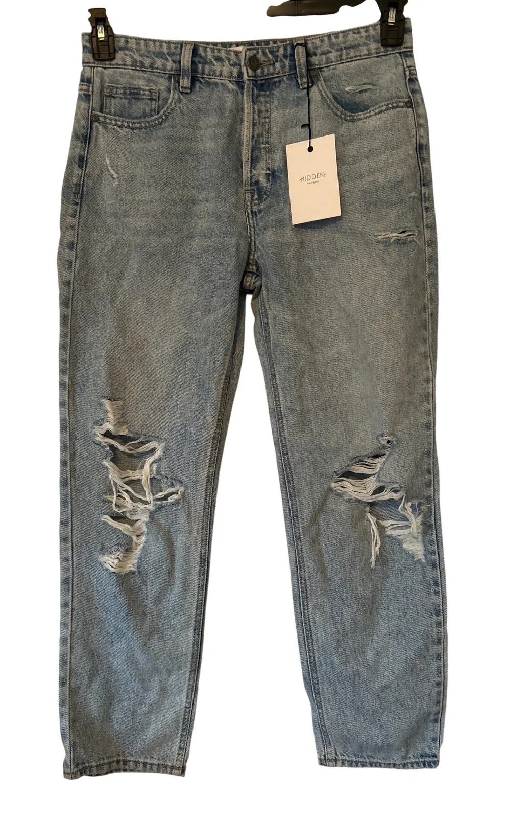 HIDDEN Los Angeles Bailey high-rise boyfriend jeans in a light wash denim with distressed detailing. These jeans offer a modern silhouette with a comfortable, relaxed fit. Perfect for casual outings or weekend adventures. Button fly Measurements: • Waist: 14 in • Inseam: 27 in • Rise: 11 in Style: Boyfriend Department: Women Fabric Wash: Light Waist Size: 28 in Type: Jeans Accents: Button, Logo Features: Distressed, Pockets, Stretch Fit: Relaxed Pattern: Solid Rise: High (Greater than 10.5 in) Fabric Type: Denim Material: Cotton Blend Closure: Button, Zip Theme: Grunge, Punk, Tattoo Model: Bailey Keywords: HIDDEN jeans, high rise, boyfriend fit, distressed denim, light wash, ripped jeans, casual wear, streetwear, modern denim, designer jeans, trendy, button fly, comfort fit