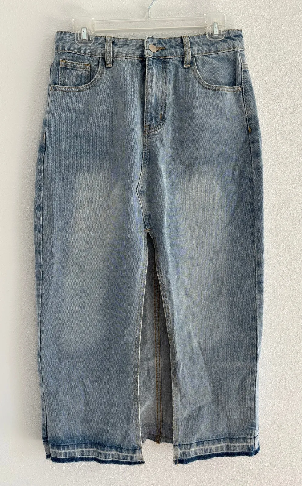 - Brand: Unbranded - Size: Women's Medium - Color: Medium Wash Denim - Details: High-Rise, Midi, Front Slit, Pockets, Raw Hem - Condition: Excellent Pre-Owned - Western, Southwestern, Ranch, Equestrian, Chore, Festival, Peasant, Prairie