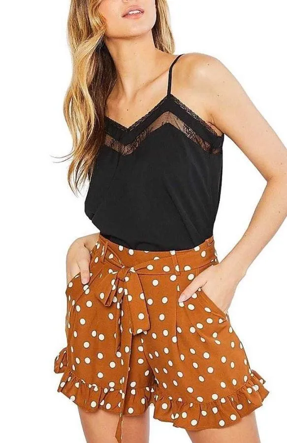 High waisted dot print shorts neutrals colors so perfect transition pieces for fall soft material and super comffy with adjustable waist with a belt and has a ruffled hem line