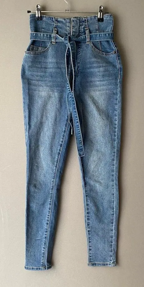 Highway Jeans sz 1 (juniors) paper bag waist blue jean pants Gently used with small stain on back right pocket. Please see photos. Pre‑loved, good condition—gently worn with typical light signs of wear Trendy Highway Jeans size 1 featuring a high-rise paper bag waist, skinny fit, belt tie, and stretch denim blend (77% cotton, 21% polyester, 1% spandex). Perfect for casual outings, weekend wear, or dress‑down workdays. Style tags: paper bag waist, high rise, skinny, stretch denim, casual, stylish Waist: 24" Hips: 39" Length: 38" Inseam: 26" Weight: 14 oz #HH01 #casual #boho #summer