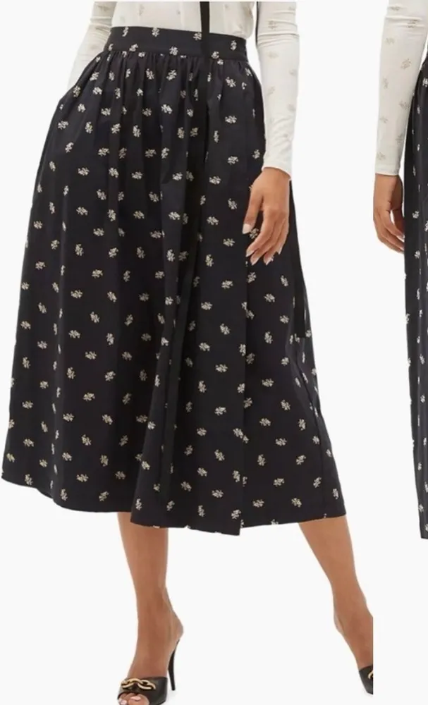 The Krista Skirt is complete with pockets, a wide waistband, and a sleek, structured design. The Khaki Floral Jacquard print features ditsy khaki-colored flowers on a classic black background. Side zipper 71% Cotton, 26% Nylon, 3% Elastane Great used condition - no flaws or signs of wear
