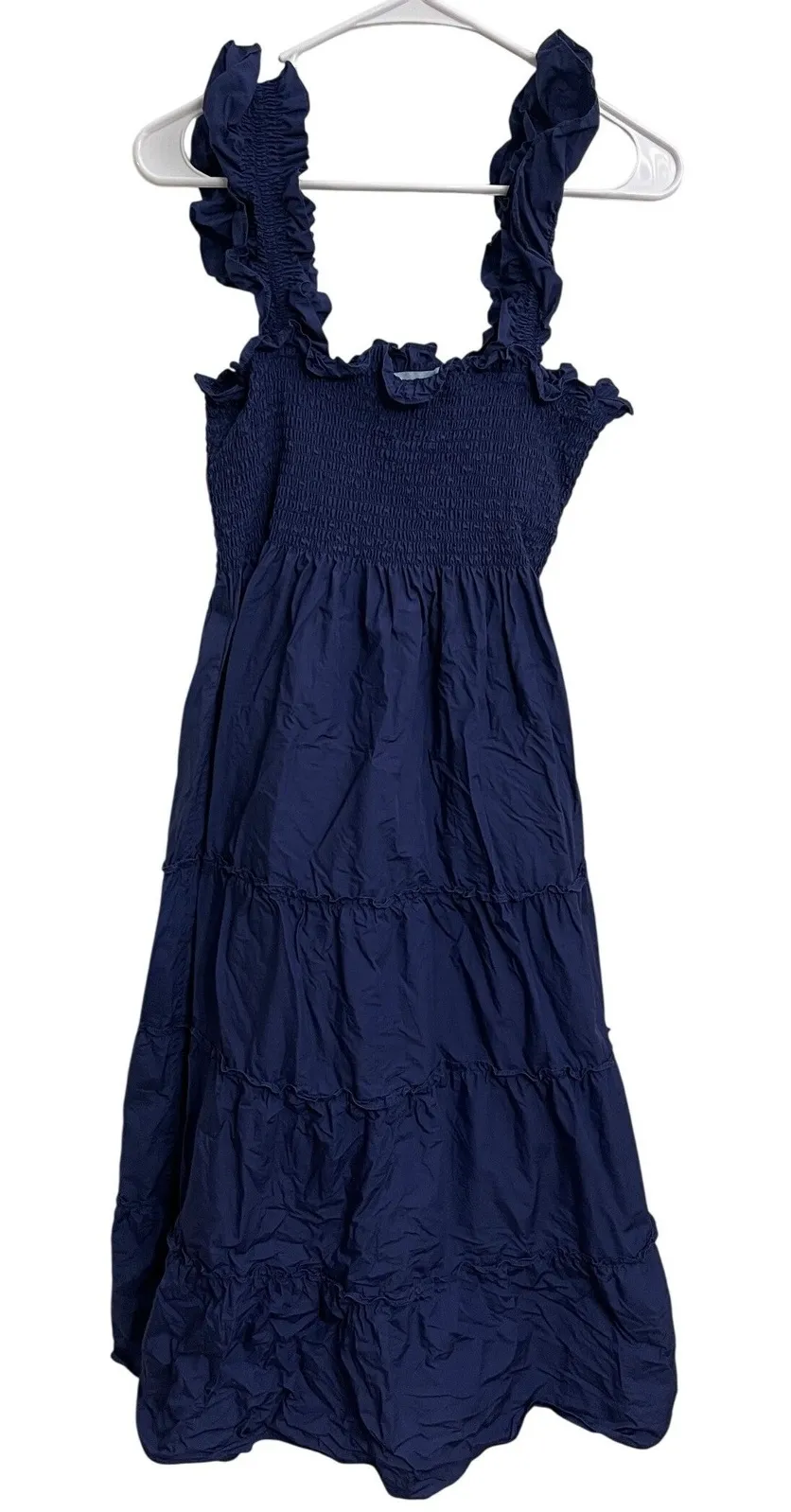 Keywords: ruffle strap dress, cottagecore, romantic dress, casual midi dress, summer dress, easy wear dress, clean girl aesthetic, classic navy Flaws: None Pit to Pit: 16in but can stretch 1 inch more if needed due to smocking Length: 46in