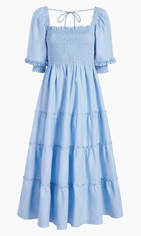 This Hill House Nesli Nap Dress in shimmering metallic blue cotton features a smocked bodice, puff sleeves, and a ruffled tiered silhouette for an effortlessly romantic look. Brand: Hill House Size: Women’s Small Color: Blue with metallic shimmer Style: Nesli Nap Dress Features: Smocked bodice, puff sleeves with elastic cuffs, tiered skirt, midi length, ruffle trim, square neckline Material: 95% Cotton, 3% Metallic, 2% Polyester Condition: Excellent pre-owned; no rips, stains, or holes Style Tags: #NapDress #SmockedBodice #TieredSkirt #PuffSleeve #MetallicCotton