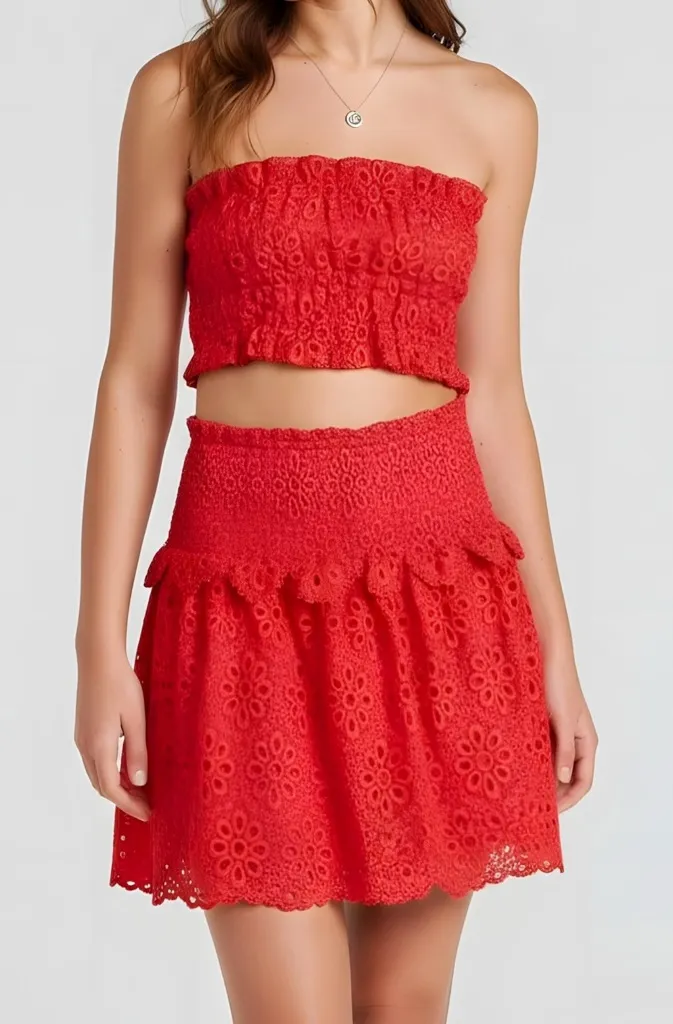 - New With Tags - Top only - Orig: $125 - Color: Poppy Red - Lightweight lace - Fully smocked bandeau designed - Daisy pattern - Lined - Shell: 100% polyester - Lining: 100% cotton - Wash cold Approx. Measurements: - Size: XS - Bust: 32” - 34” - Length: 8” Actual item for sale is shown using a mannequin. For sizing reference, our mannequin’s measurements: Bust: 35.5” | Waist: 26.5” | Hips: 38.5” | Height: 5’11
