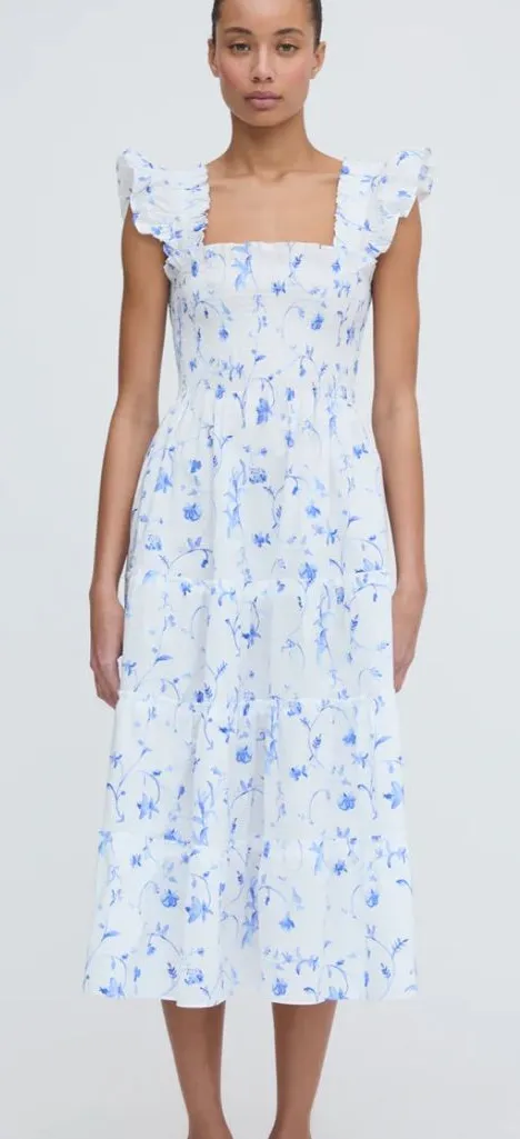 Meet the wear-everywhere Nap Dress®. It’s our signature garment; soft, comfortable, and pretty enough to wear all day and night. The Ellie is an A-line Nap Dress® with our proprietary, elasticated Nap Smocking™, ruffled shoulders, tiered midi skirt, and pockets. We worked with artist Leïla Dubus to create a watercolor design based on vintage floral prints. We added subtle bows and a few hidden animals to keep it fun. Size XS Like new! 13.5” pit to pit 11.5” waist 45” length (16)