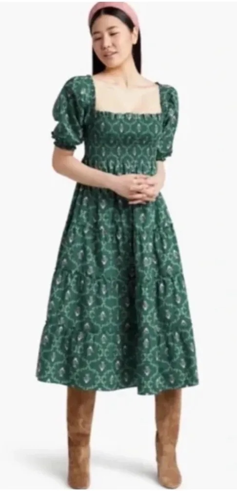 The Nesli is a Nap Dress with elasticated smocking, a tiered midi skirt, and dramatic puff sleeves. Fits both naps and busy schedules perfectly. In Emerald Trellis - a classic Hill House pattern. Pristine condition