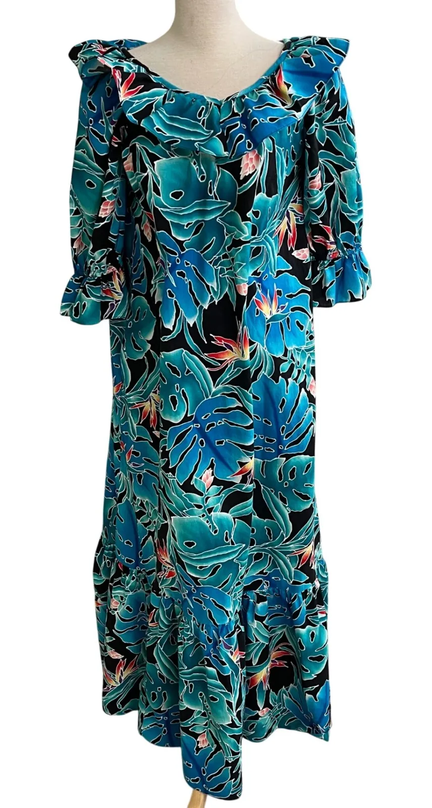 Hawaiian maxi dress in a vibrant turquoise blue and black floral print. Features a ruffled neckline and cuffs, three-quarter length sleeves, and a tiered ruffled hemline. This beautiful dress is perfect for a luau, beach vacation, or casual resort wear. Bin 30 pre owned See all approx measurements
