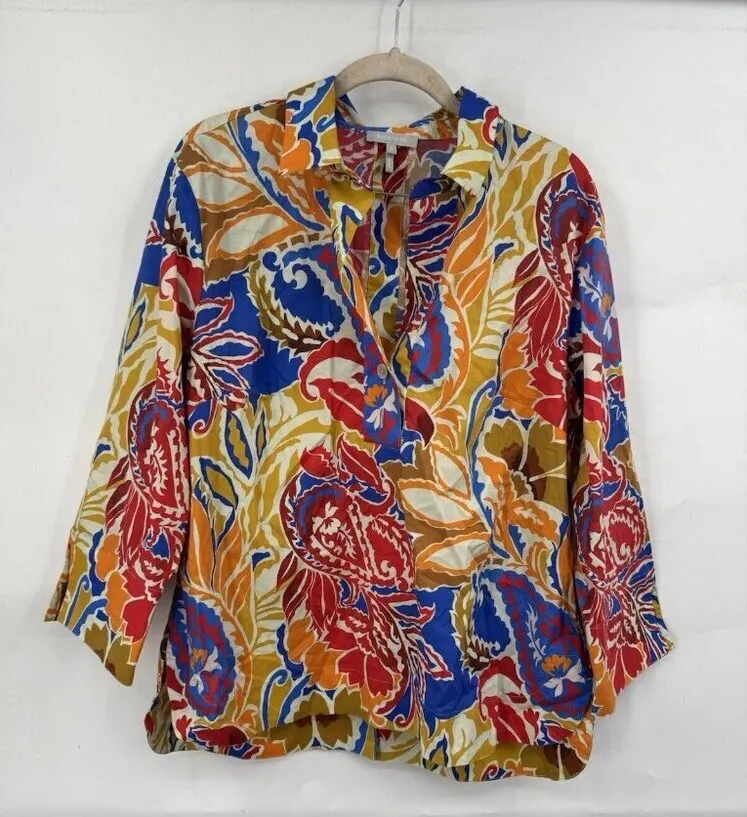 The Aileen Top features the signature Hinson Wu tailoring and attention to detail. This crisp cotton popover is now available in a crisp and colorful paisley print. Button detail down the center back creates a statement top in bold colors that are sure to get you noticed! Pointed collar Popover 2 button front placket All over paisley print Center back button placket 3/4 sleeve with split cuff High low rounded hem Relaxed fit Excellent pre owned condition. All measurements are approximate: 21 inches pit to pit. 14 inch sleeve from cuff to pit. 27 inch length from shoulder to bottom hem. GG16