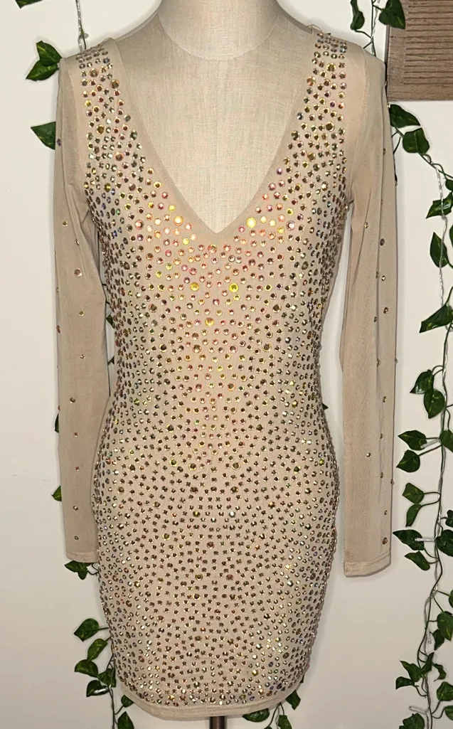 HMS Hot Miami Styles V-Neck Bodycon Midi Mesh Sleeve Rhinestone Dress Tan Size M - $65 - From Abby