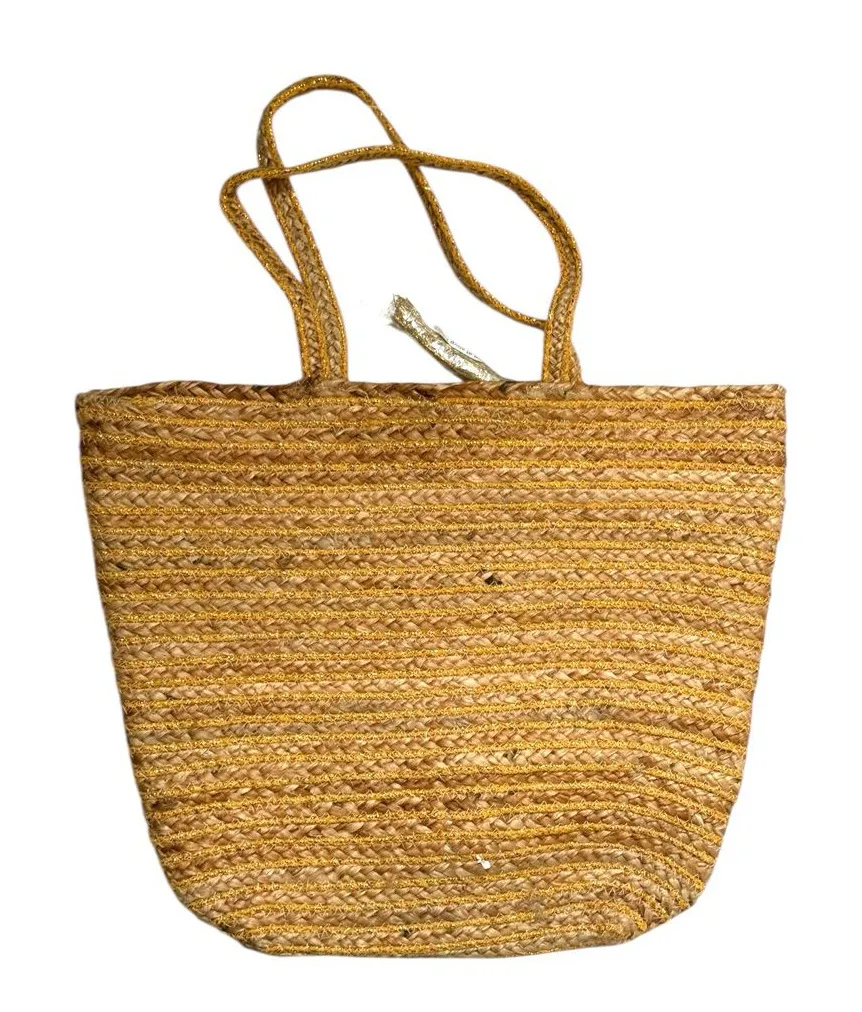 From hobby lobby a few years ago. Has tassle. Never used. Tags have been removed. Well made, substantial thick material. Great for the beach. 40% jute, 26% polyester, 21% cotton, 8% viscose, and 5% acrylic.